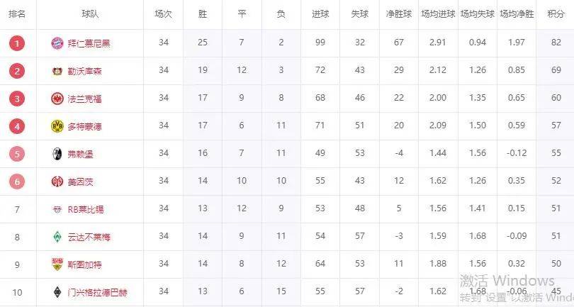 在本轮比赛前,拜仁高居榜首,提前夺冠,而勒沃库森也确定排在第2名,这样的话,欧冠资格还有2个。本轮拜仁客场4-0大胜霍芬海姆,而勒沃库森2-2打平美因茨,这样的话,拜仁最后的积分为82分,排在第1,而勒沃库森积69分,排在第2。